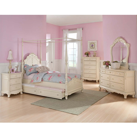 The Cinderella Collection is your little girl's dream. The Victorian styling incorporates floral motif hardware, antique ecru Finish and traditional carving details that will create the feeling of a room worth of a fairy tale princess. A Canopy bed completes the fantasy of this whimsical collection. Turned posts reach for the heights and are topped with carved finials. The additional trundle provides the extra sleeping space for princesses visiting from other kingdoms. Also available in Ecru Finish. Twin Trundle is available and sold separately